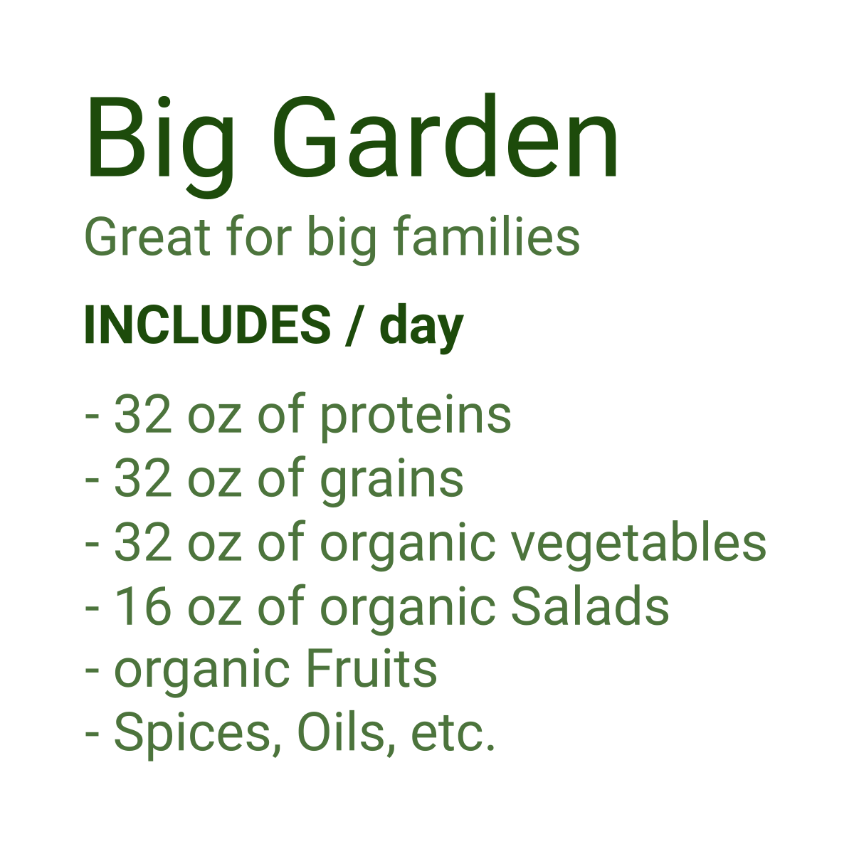 For a family of 4 to 5 adults, this weekly plan offers a box of around 30 to 40 LBs, for the 5 days option, of our healthy ingredients with top grade halal proteins.